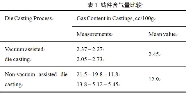 表1為瑞士某真空廠家與Ohio State University聯(lián)合實驗的數(shù)據(jù)。使用真空和不使用真空時,平均每100g鑄件中氣體的含量分別為2.45cc和12.9cc。而且使用真空生產(chǎn)時,生產(chǎn)工藝更加穩(wěn)定。